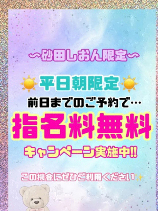| はじめまして! 砂田しおん(すなだしおん)です。 ◆出勤スケジュール◆ 平日10:00~14:00 週末21:00~04:00 ◆砂田限定オプション◆ じっくり指圧、極液、足ツボ、フェイス・ヘッドマッサージなど… ◆コメント◆ 私自身も肩こりなどに悩ませれていて、いろんなリラクゼーション店を訪れ、とても心身ともに癒されたので、そういう人になりたいなと思いセラピストになりました。 昨年、リンパケアセラピストの資格を取得してから、さらにリラクゼーションへの関心が高まり、様々な資格取得を目指し、日々勉強中です! 色白むちむち体型でマイペースな性格です。 いろんな方にお会いして、いろんなお話を聴くのが楽しみです♪ たくさんの方に逢えたらいいなと思っております☆ | |||